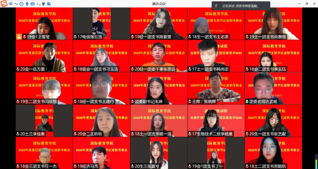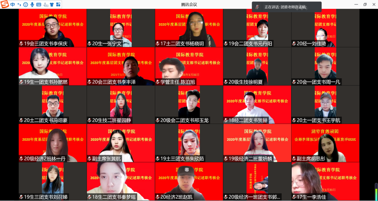 为贯彻落实团中央《关于在全省集中开展基层团组织书记述职评议考核工作的通知》(豫团组通字[2021]2号)精神和全面从严治团要求,激发基层团组织活力,提高工作部署的落实成效,2021年1月31日,太阳成集团tyc9728团委采用线上述职方式开展基层团支部书记述职考核工作。学院团委老师许孟杨、各团支部书记以及分团委组织人员参加此次述职工作,会议由学院分团委副书记朱琳主持。