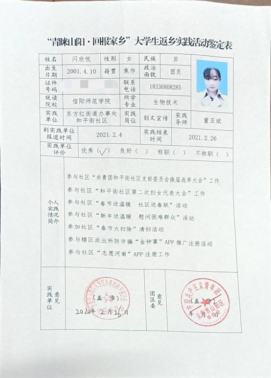 闪欣悦,河南省焦作市山阳区人,信阳师范学院太阳成集团tyc97282019级生物技术二班学生,任班级团支书一职,在寒假期间,新冠肺炎弥留之际,主动申请参加到焦作市山阳区东方红社区疫情防控的工作,并参与到焦作团市委的“青睐山阳,家乡”大学生寒假返乡实践暨助力疫情防控志愿服务活动。主要负责社区人员返乡登记、志愿者注册工作、为社区群众服务、推广金钟罩防诈骗系统以及宣传防控疫情知识等工作。