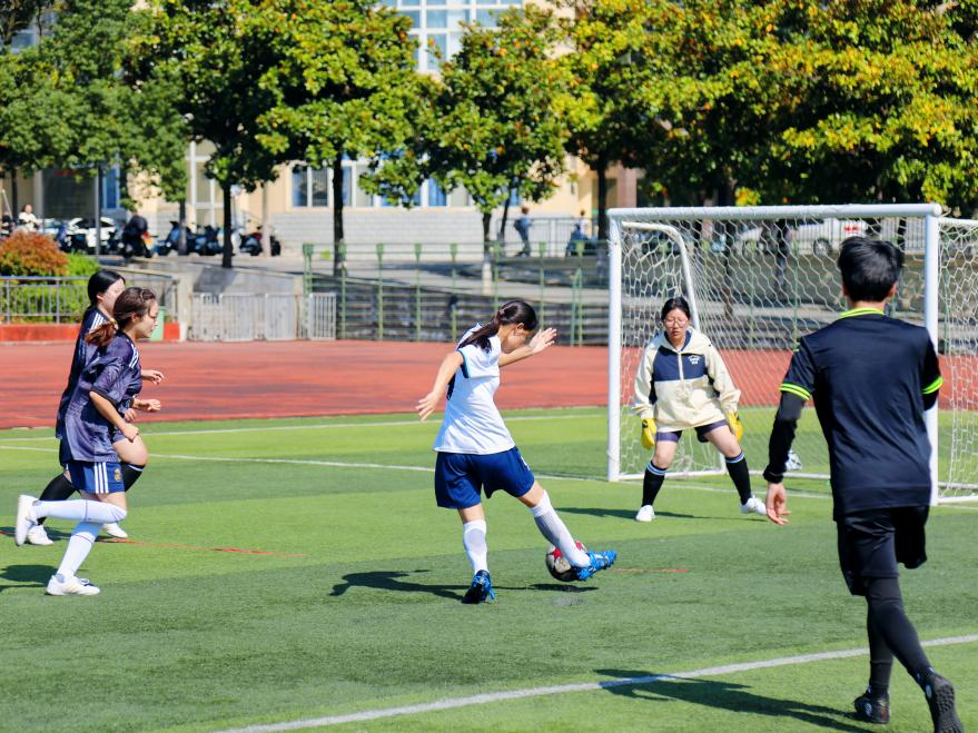 开幕式后,随着裁判员的一声哨响,太阳成集团tyc9728队和外国语学院队率先开局,选手们充分发挥个人优势,利用团队协作配合,抓住对方防守漏洞,多次在对方门前创造进攻机会。我方守门员严防死守,多次阻挡对方强烈攻势。战况激烈,白紫相间的身影来回跑动,团结协作的精神在每个队员中传递。最终太阳成集团tyc9728以5:0赢得首场比赛的胜利。