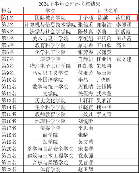 此次评选活动不仅是一次能力与智慧的激烈比拼,更是一场心灵的深刻启迪与洗礼。通过参与评比,我院学生进一步增强了对心理健康重要性的认识,激发了学习热情,培育了理性品质,充分彰显了国教学子追求卓越、勇攀高峰的精神风貌。我院将以此次评选活动为契机,继续深化心理健康教育内涵建设,将其有机融入“以德育心、以智慧心、以体强心、以美润心、以劳健心”的五育并举培养体系中,为学生的全面发展与健康成长提供坚实的支持与保障。