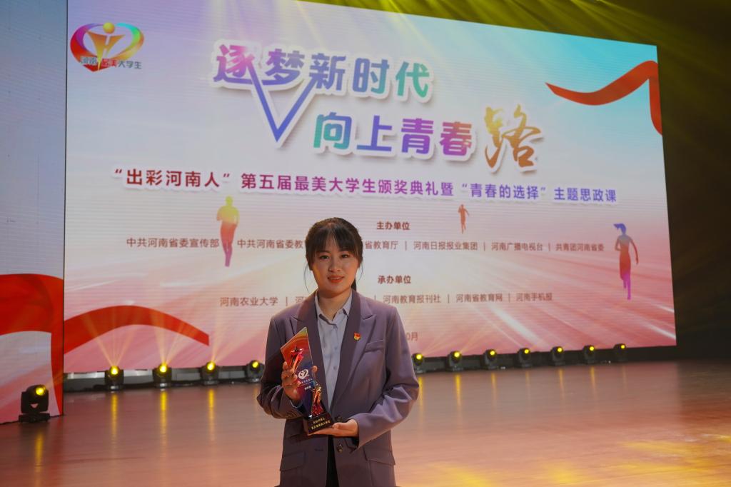 10月14日下午,由中共河南省委宣传部、中共河南省委教育工委、河南省教育厅、河南广播电视台、共青团河南省委联合举办的“出彩河南人”第五届最美大学生颁奖典礼暨“青春的选择”主题思政课在河南农业大学举行,经学校推荐、专家初评、现场答辩、公众投票、组委会终评等环节,我校学子涂采莉从115所高校推荐上报的118名学生中脱颖而出,被授予河南省“最美大学生”荣誉称号,并应邀赴现场参加颁奖典礼。