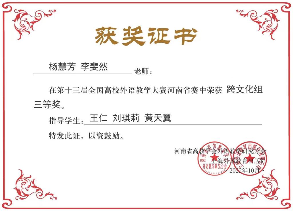 第十三届全国高校外语教学大赛河南省赛在郑州胜利闭幕,由我院英语教研室主任李斐然担任指导教师,2020级会计学1班学生刘琪莉,2019级会计学2班学生黄天翼组成的参赛队伍经过案例表演、评委问答、组委会终评等环节,从全省50余所本科院校103名选手中脱颖而出,斩获“跨文化组”三等奖。