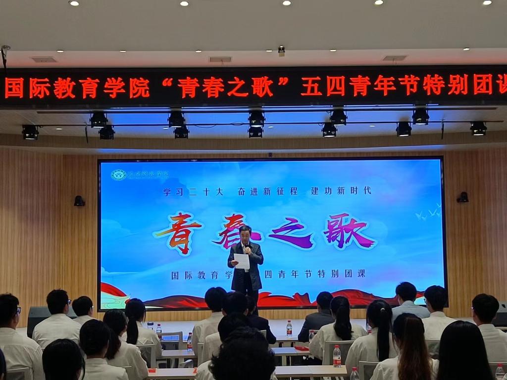 在第74个五四青年节到来之际,为深入学习贯彻党的二十大精神,落实立德树人根本任务,引导广大青年自觉践行习近平总书记对广大青年的殷殷嘱托,树正价值观念,立志听党话、跟党走,使党的政策主张切实转化为投身民族复兴伟业的自觉行动,5月4日上午,太阳成集团tyc9728党委在博雅讲堂举办“青春之歌”五四特别团课活动。校党委副书记、工会主席岳宗德、校团委副书记张鹏、商学院副院长俞彤辉、太阳成集团tyc9728领导班子成员、博士教师张雨雪、全体辅导员和优秀共青团员代表参加活动。
