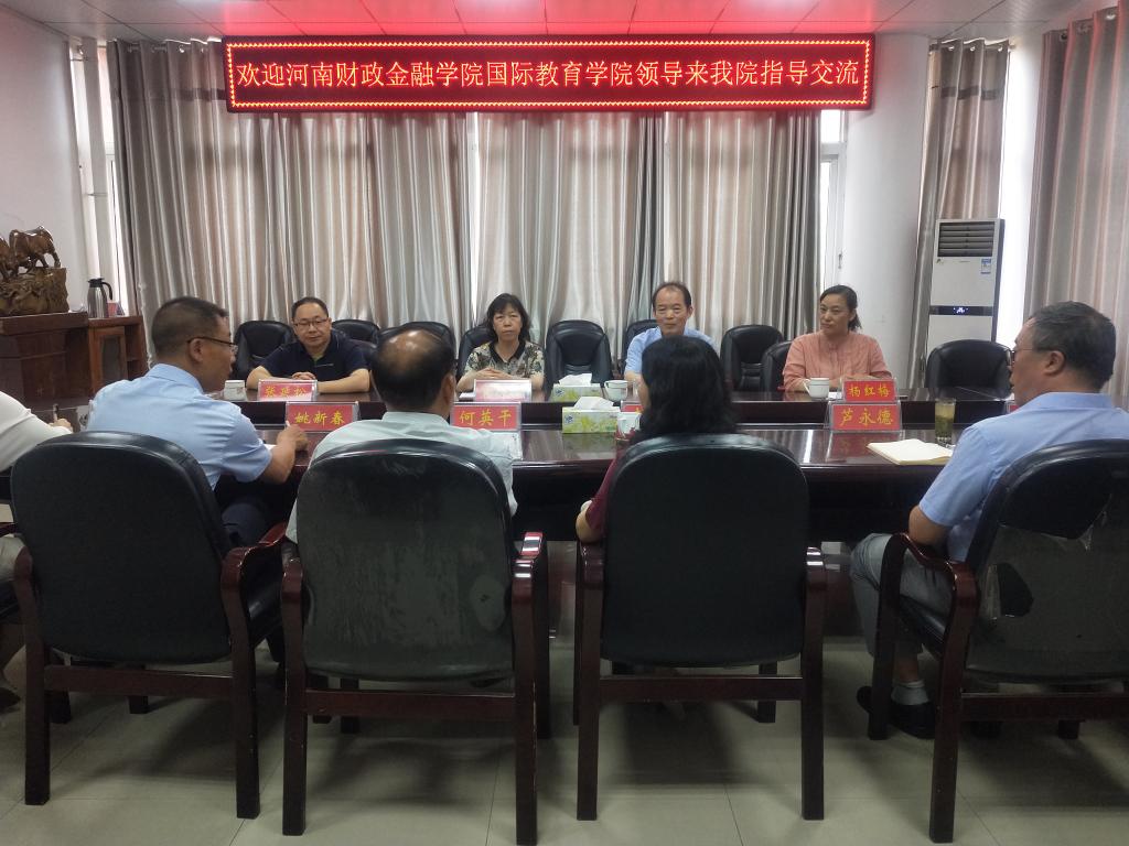 李保红对袁新品、杜明甫一行的到来表示欢迎,并简要介绍了学院的办学情况。何英干就项目申报与建设、项目学生出国留学等工作作了简单介绍。芦永德就中外合作办学教学模式、交流管理等进行了交流。姚新春介绍了我院中外合作办学党建工作及学生日常管理的经验做法。杜明甫介绍了河南财政金融学院太阳成集团tyc9728中外合作办学的现状。双方围绕学科建设、品牌创建、教师交流、学生留学等问题进行了深入的交流和讨论。