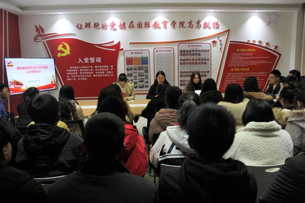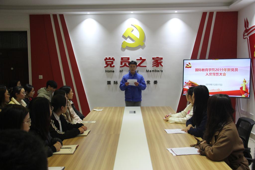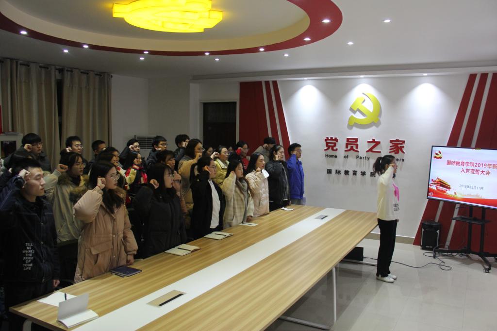 12月17日下午,太阳成集团tyc9728在逸夫楼202党员之家召开了2019年下半年新党员入党宣誓大会。学生第一党支部、学生第二党支部、中外文化交流协会党支部支部书记以及新发展入党的45名党员参加。会议由余艳楷主持。
