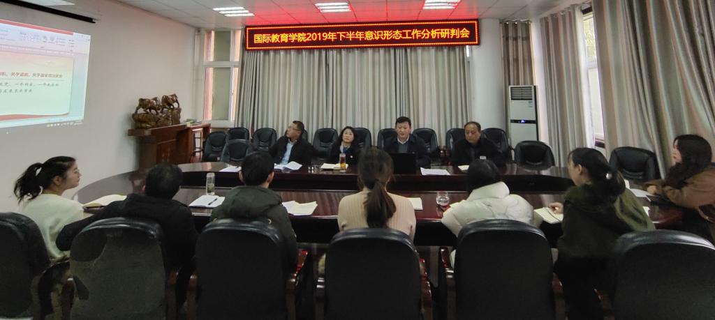 为深入贯彻落实意识形态工作责任制,把意识形态工作各项任务落到实处,12月17日下午,国际教育学院在逸夫楼302会议室召开2019年下半年意识形态工作分析研判会。学院领导班子成员,科级干部以及辅导员班主任参加。会议由姚新春主持。