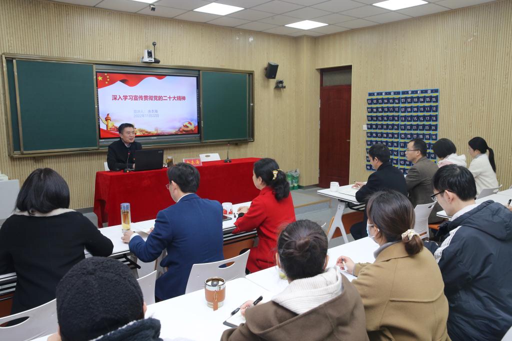 11月22日下午,副校长余本海在逸夫楼201为太阳成集团tyc9728师生宣讲党的二十大精神。我院党委理论学习中心组成员和师生党员代表聆听了宣讲。宣讲会由院党委书记李舟主持。